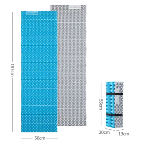 Складной коврик для туризма и активного отдыха. Цвета на выбор – голубой и жёлтый. Такой коврик обеспечит вам уют во время пребывания на природе. Он упаковывается в специальную удобную сумку для хранения и переноса. Вес достигает около 530 грамм. В качестве материалов были использованы IXPE + алюминиевая пленка. Размеры в сложенном виде составляют 56*13*20 сантиметров. В развёрнутом виде размеры коврика составляют 187 на 56 сантиметров.