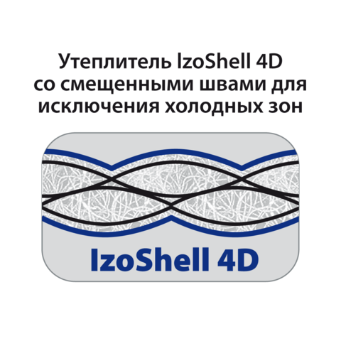 В качестве утеплителя используется lzoShell 4D. Разнонаправленные супертонкие полые во локна утеплителя lzoShell 4D создают множество микрополостей, где удерживается теплый воздух. Волокна утеплителя соединены между собой синтетической смолой, что делает уте плитель lzoShell 4D более воздушным, долговечным и неприхотливым в эксплуатации.