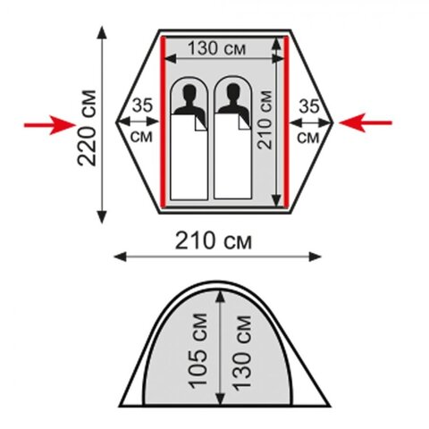 Два входа — удобно входить/выходить из палатки. Также они обеспечивают проточную вентиляцию — актуально для летнего отдыха.