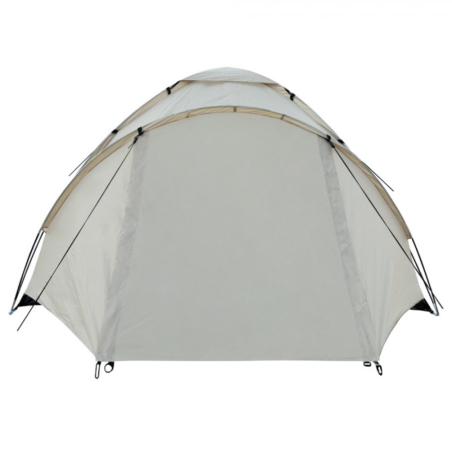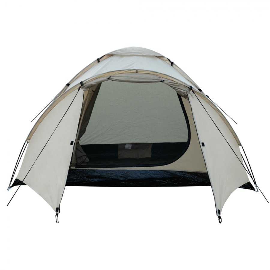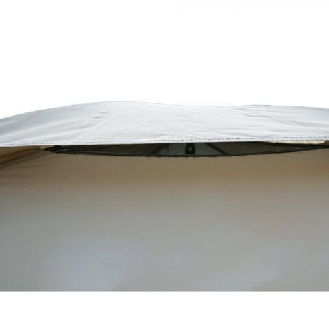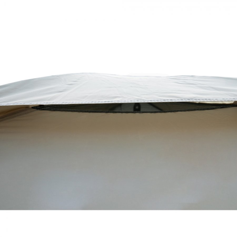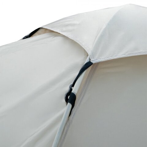 Тент – водонепроницаемый, устойчивый к растяжению. Вентиляционное окно расположено в верхушке купола. Обработан составом для поглощения UF лучей и пропиткой, предотвращающей распространение огня. Оборудован растяжками с вплетением светоотражающей нити и проклеенными швами.